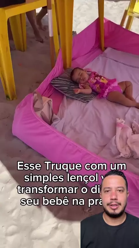 Essa mãe usou a criatividade! 😍 Com um lençol de elástico preso entre as cadeiras, ela criou um bercinho improvisado pra praia. O bebê fica seguro, confortável e pode brincar ou dormir tranquilo. 🏖️💤 #dicas #façavocêmesmo #dicastechcesar #mae #praia