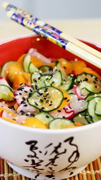 Vocês me pediram muuuito para trazer mais receitinhas orientais! Então, hoje, trouxe uma versão de sunomono com pepino japonês, cenoura e rabanete, para dar aquela incrementada na sua salada! 😋😍 Ingredientes: - 1 pepino japonês - 1 cenoura - 4 rabanetes - 3 colheres (sopa) de sal - 4 colheres (sopa) de vinagre de arroz - Sal, a gosto - 3 colheres (sopa) de açúcar - Gergelim branco, a gosto - Gergelim preto, a gosto #receita #receitas #receitasfaceis #receitasimples #sunomono