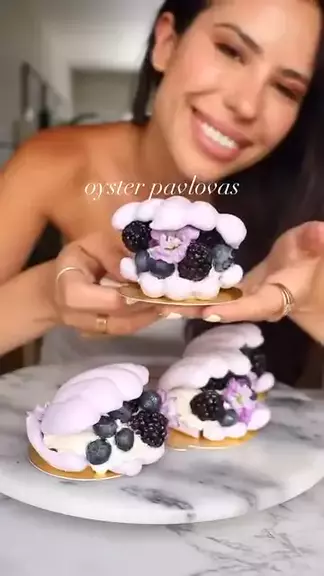 Pavlovas de ostra 🫐 Não aguento mais, que sonho! Recheei com curd de limão, chantilly e cobri com frutas vermelhas e flores comestíveis. Técnica inspirada na brilhante @mamma_pavlova 🤍 By:@_bellabakes #pavlova #doce #viraliza #maisviews #mejalo