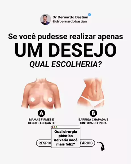 ❓Se pudesse passar por uma cirurgia plástica agora, qual resultado te faria mais feliz? 👇🏻 🤳🏻 A) Um colo mais bonito com seios firmes B) Abdômen lisinho e cintura desenhada Comenta aqui: A ou B? Vamos ver qual é o mais desejado! 👙 E se você respondeu os dois… fica tranquila, porque a combinação é possível e segura quando feita com um time experiente! 💬 Fale com a nossa equipe e descubra como realizar sua transformação dos sonhos com segurança e resultados naturais. #drbernardobastian
