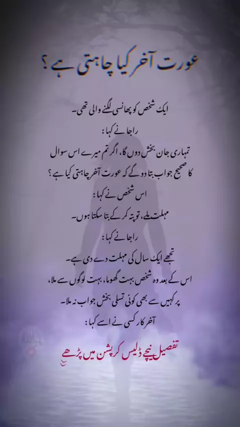 آخر کار کسی نے اسے کہا : دور جنگل میں ایک چڑیل رہتی ہے، وہ اس سوال کا جواب ضرور بتا سکتی ہے۔ وہ شخص اُس چڑیل کے پاس پہنچا اور اپنا سوال اُسے بتایا۔ چڑیل نے کہا کہ : میں ایک شرط پر بتاؤں گی کہ اگر تم مجھ سے شادی کر لو۔ اُس شخص نے سوچا : صحیح جواب معلوم نہ ہوا تو جان راجا کے ہاتھ جانی ہی ہیں، اسی لئے شادی کرنے پر رضامند ہو گیا۔ شادی ہونے کے بعد چڑیل نے کہا : چونکہ تم نے میری بات مان لی ہے تو میں نے تمہیں خوش کرنے کے لئے فیصلہ کیا ہے کہ بارہ (12) گھنٹے چڑیل اور بارہ (12) گھنٹے خوبصورت پری بن کے رہ...