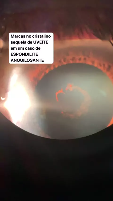Marcas deixadas no cristalino , após a inflamação da íris chamada UVEÍTE , essa iris chegou a ficar colada no cristalino, e deixou sua marca… Isso aconteceu com um paciente com diagnóstico de ESPONDILITE ANQUILOSANTE, doença ligada ao gene HLAB27…