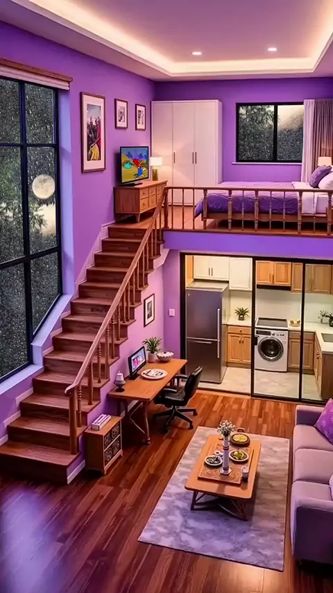 Apartamento Loft Roxo dos Sonhos 💜 | Ambiente Aconchegante com Chuva Entre neste loft dos sonhos em tons de roxo! 💜✨ A combinação perfeita de aconchego e design moderno, com uma cozinha única em vidro e um quarto tranquilo no mezanino. Imagine relaxar aqui numa noite chuvosa! Qual é a sua parte favorita neste projeto? Conte pra gente nos comentários! 👇 Não se esqueça de Curtir e se Inscrever para mais designs incríveis!