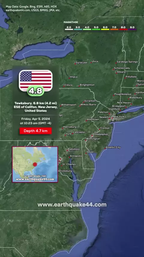 New York Earthquake - Tewksbury, 6.8 km (4.2 mi) ESE of Califon, New Jersey, United States ▶️ Local time at epicenter: Friday, Apr 5, 2024, at 10:23 am ▶️ Epicenter: Tewksbury, NJ, USA ▶️ Magnitude: 4.8 ▶️ Depth: 4.7 km #earth44 #earthquake #earthquakes #newyork #NewJersey #UnitedStates # #viral #trending