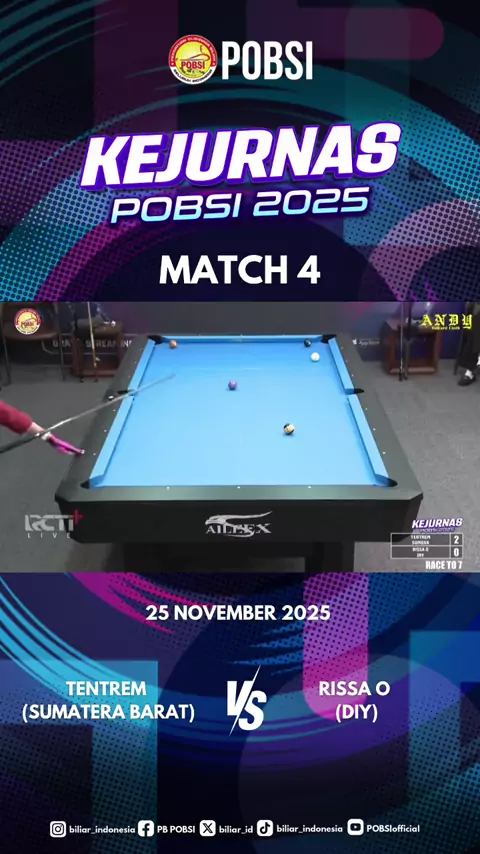 π± Kejurnas POBSI 2025 β 9 Ball Single Putri Pertandingan 9-Ball Single Putri kali ini mempertemukan Tentrem (Sumatera Barat) dengan Rissa O (Daerah Istimewa Yogyakarta). Duel berlangsung sengit sejak awal, dengan kedua atlet menunjukkan akurasi pukulan dan kontrol meja yang sama kuatnya. Pertukaran poin terjadi cukup ketat, membuat tensi pertandingan terus meningkat di setiap rack. Memasuki fase akhir laga, Rissa tampil lebih stabil dan berhasil memanfaatkan beberapa celah krusial. Ia akhirnya...
