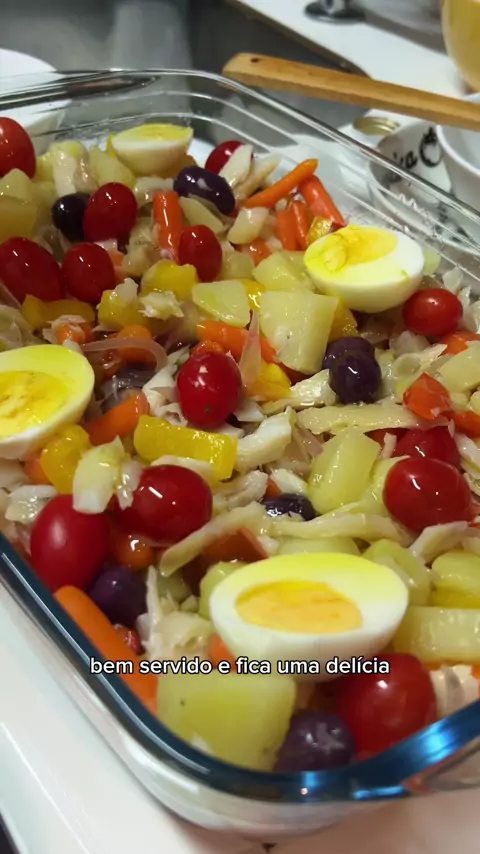 Salada de bacalhau Ingredientes: -800g de bacalhau dessalgado -3 baratas -200g de cenoura (utilizei a baby) -3 ovos cozidos -15 tomates cereja -12 azeitonas preta -1 cebola roxa -1/2 pimentão vermelho -1/2 pimentão amarelo -Azeite pra refogar e regar a gosto #salada #receitas #receitasimples #receitasfaceis #bacalhau