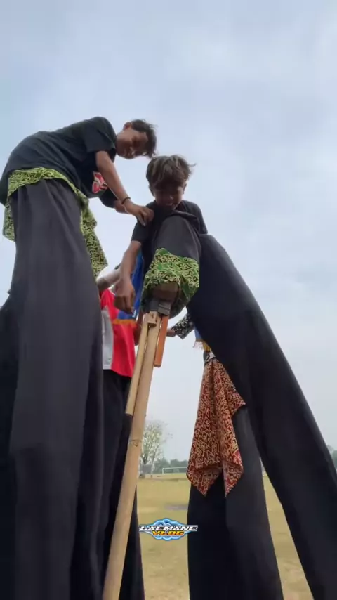 betapa susahnya memakai celana jangkungan sampai di bantu banyak teman ๐ญ#kakipanjang#jangkungan#enggrang