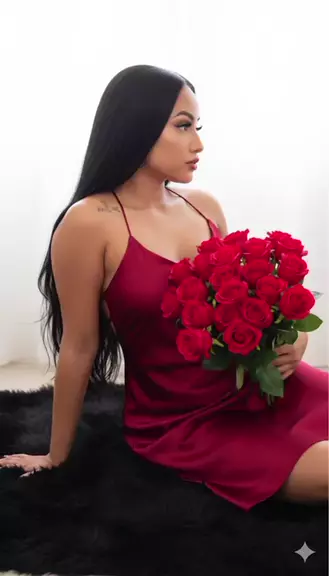 Uma mulher vista por trás, sentada no chão sobre um tapete preto de pelos. Seu corpo está levemente inclinado para o lado, com uma mão no chão, e a cabeça ligeiramente inclinada. Ela tem cabelo médio preto escuro solto com algumas pequenas ondas e está usando um elegante vestido de cetim rosa sem alças nas costas.