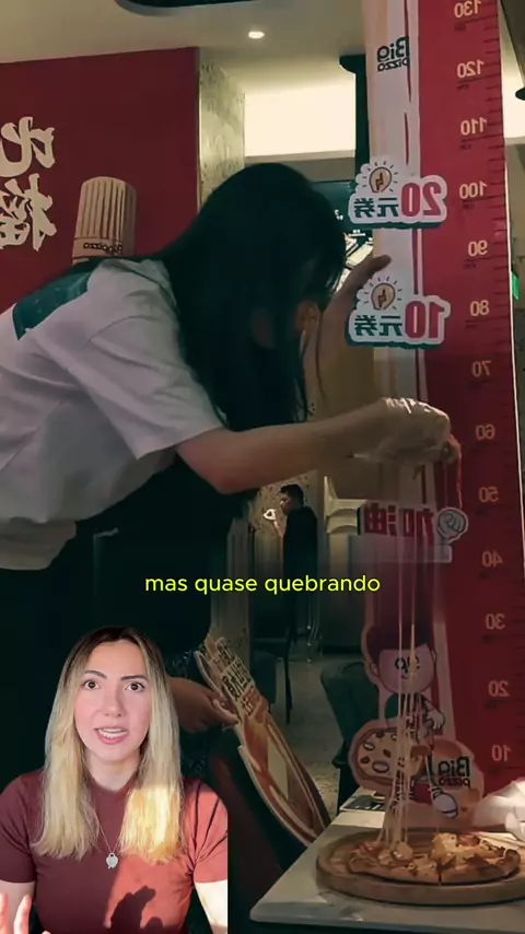 Ela pode ganhar uma pizza grátis se conseguir esticar o queijo até o topo