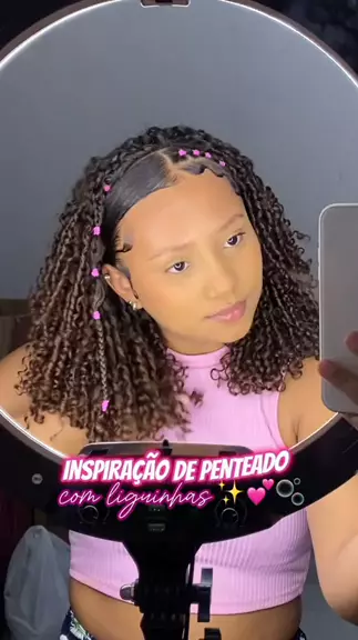 Inspiração de penteado com liguinhas, oque vocês acharam? Deixem aí nos comentários ✨💕🫧 . . . . . . . . . . #tutorial #Cachos #cacheadas #prnteado #penteadocomliguinhas