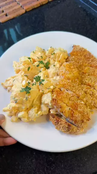 Frango Empanado feito na Air Fryer com Salada de Batatas para o almoço de sábado 😍🍗🥔🥗🍽️ Para a Salada de Batatas: 5 batatas médias 🥔 3 ovos cozidos (usei só as claras) 🥚 Temperos a gosto (usei sal, páprica, pimenta do reino e limão) 🧂 2 c.s mostarda 5 c.s maionese Para o Frango: Peito de frango Temperos a gosto (usei sal, páprica e pimenta do reino) Farinha de trigo 2 ovos batidos Farinha panko #receitas
