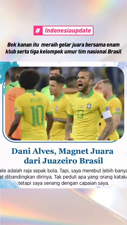 Added by @hariankompas Harian Kompas post Selama 20 tahun berkarier sebagai pesepak bola profesional, trofi juara seakan selalu mengikuti ke mana pun Dani Alves (38) bermain. Bek kanan itu meraih gelar juara bersama enam klub serta tiga kelompok umur tim nasional Brasil. Terbaru ia mengantar Brasil merebut medali emas sepak bola Olimpiade Tokyo 2020. Sejauh ini, Alves telah meraih 44 trofi juara atau rata-rata meraih minimal dua gelar juara setiap tahun. Koleksi trofi itu membuat Alves menjadi