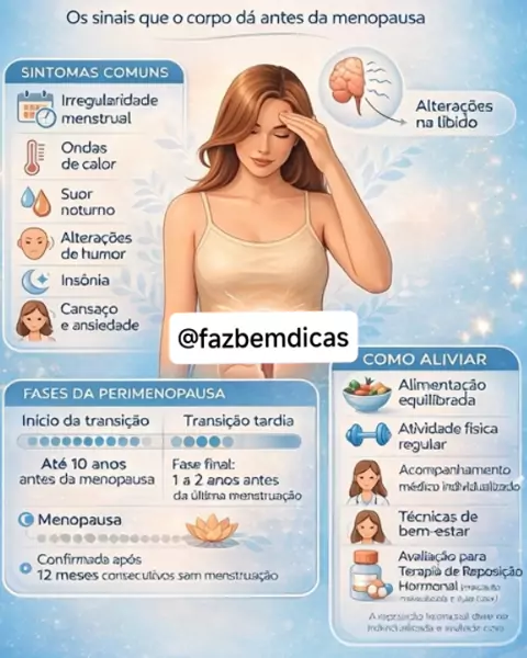 Antes da menopausa chegar oficialmente, o corpo passa por uma fase de transição chamada perimenopausa — e ela pode começar anos antes da última menstruação. ✨ Sintomas mais comuns: 🔹 Irregularidade menstrual 🔥 Ondas de calor 💧 Suor noturno 😔 Alterações de humor 🌙 Insônia 😣 Cansaço e ansiedade 💞 Alterações na libido Tudo isso acontece por causa das oscilações hormonais 🧬 #mulher #Saúde