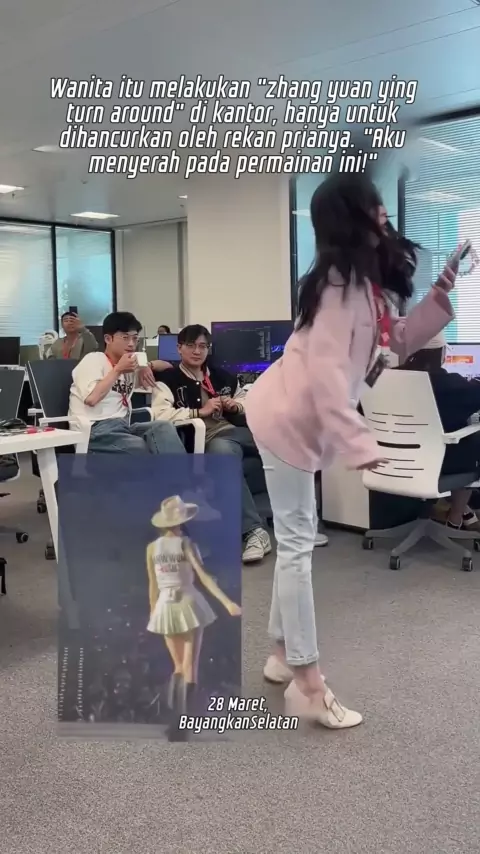 Wanita itu melakukan "zhang yuan ying turn around" di kantor, hanya untuk dihancurkan oleh rekan prianya. "Aku menyerah pada permainan ini!"