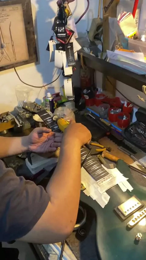 Proses akhir refret gitar Gibson dari Jakarta polish fret pakai mesin biar kinclong