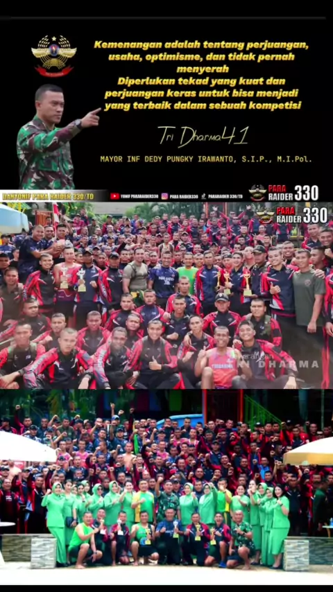 Kemenangan adalah tentang perjuangan, usaha, optimisme, dan tidak pernah menyerah Diperlukan tekad yang kuat dan perjuangan keras untuk bisa menjadi yang terbaik dalam sebuah kompetisi DANYONIF PARA RAIDER 330/TD#TerimaTantanganRoyco#pararaider330#kostrad#tniad#divif1#HelloHongKong#jawabarat##trending#persitkartikachandrakirana#tentara#cicalengka#dudungabdurachman#komandolatihanpertempuran#pangkostrad#raider#tniviral#siliwangi#tentara#juara