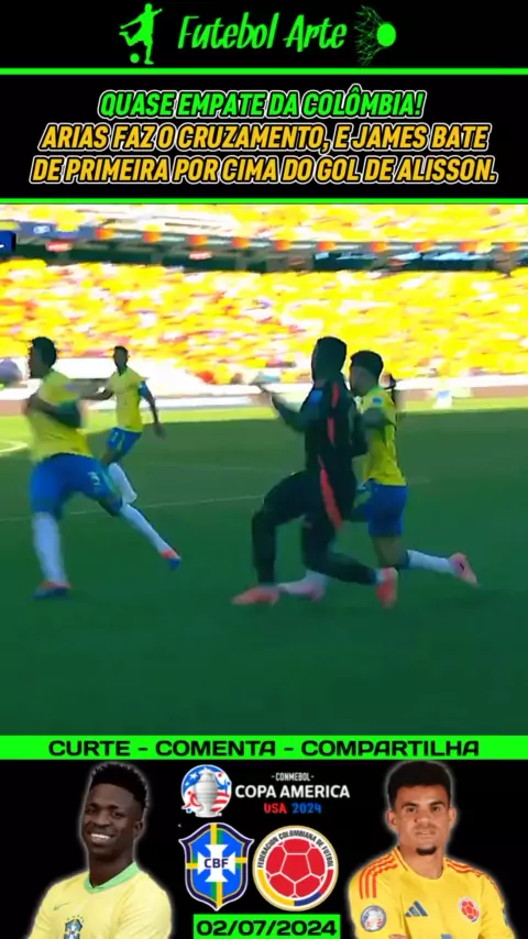 QUASE EMPATE DA COLÔMBIA! Arias faz o cruzamento, e James bate de primeira por cima do gol de Alisson. #CopaAmerica #Brasil #Colombia #BrasilxColombia #Esporteviral