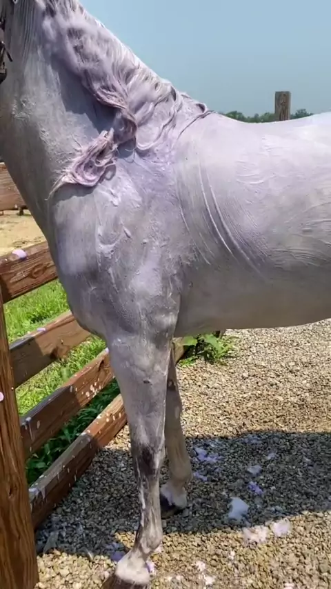 Scrubbing a brown horse to be grey again😂#beforeandafter#rackinghorse#greyhorseproblems#bathtime#grooming#horsesof#equestrian#