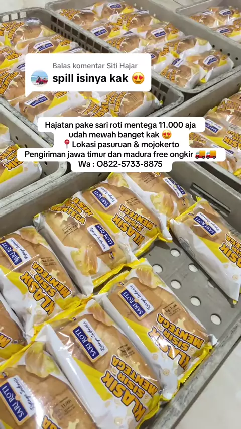 Membalas @Siti Hajar isi sari roti sisir mentega ya kak 🫶 yg mau ada hajatan atau acara bisa pakai sari roti ya kak‼️🥰 Mulai 4.000 an aja. Lokasi toko : Pasuruan & Mojokerto Pengiriman jawa timur dan madura free ongkir 🚚🚚 Wa : O822 - 5733 - 8875###sariroti##hajatan##wedding##acara##tasyakuran