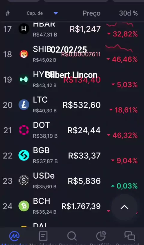 Bitcoin com uma baixa relevante, bem como muitas outras. Gilbert Lincon.