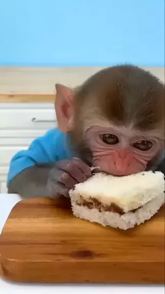 Delicioso bebé mono comiendo un pastel_ ¡Mira cómo devora este delicioso postre!. #AnimaisFamilia #monito