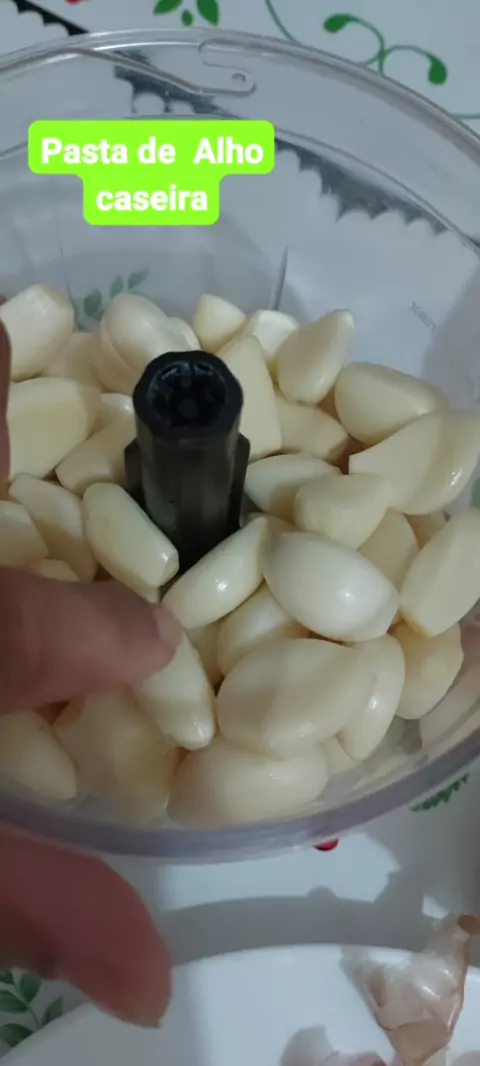 pasta caseira de alho: 500g de alho, 1 xic de óleo ou azeite( adicione mais se necessário até formar uma pastinha) e 1 colher de sopa de sal. Coloque tudo no mixer ou liquidificador.#pastadealho #alho #dicasdecozinha #cozinha #SupercopaNoKwai