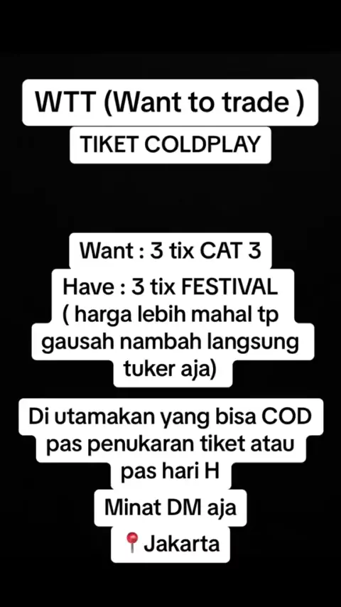 Cari tukeran CAT 3 atau tukar tambah CAT 4a/b #warcoldplayjakarta #wtb #wtt #coldplayconcert #coldplayjakarta #wartiketcoldplay #warticketcoldplay