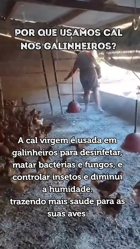 A cal virgem é usada em galinheiros para desinfetar, matar bactérias e fungos, e controlar insetos