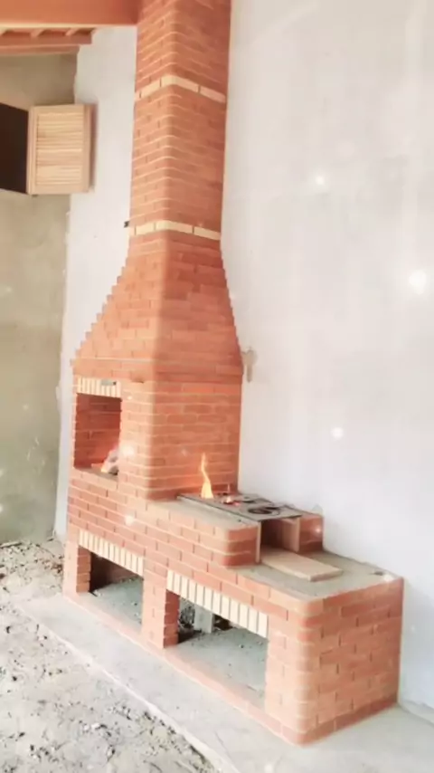 churrasqueira e fogão nós tijolos vermelho com detalhes nos tijolos palha 😍😍😍
