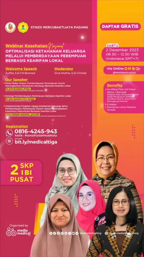Webinar Kebidanan, GRATIS! “Optimalisasi Ketahanan Keluarga Melalui Pemberdayaan Perempuan Berbasis Kearifan Lokal” 🗓 Sabtu, 2 Desember 2023 🕐 08.30 - 12.30 WIB (GMT+7) ✅ 2 SKP IBI PUSAT 🌐 Organized & Supported STIKes MERCUBAKTIJAYA Padang Media Medical ---#bidan#midwife#bidanindonesia#kesehatan#pelatihan#seminar#infoseminar#seminarbidan#tenagakesehatan#nakes#seminarnasional#free#skpibi#ibi#webinar#seminargratis#ketahanankeluarga#pemberdayaanperempuan#kearifanlokal#webinarkesehatan#mediamedi...