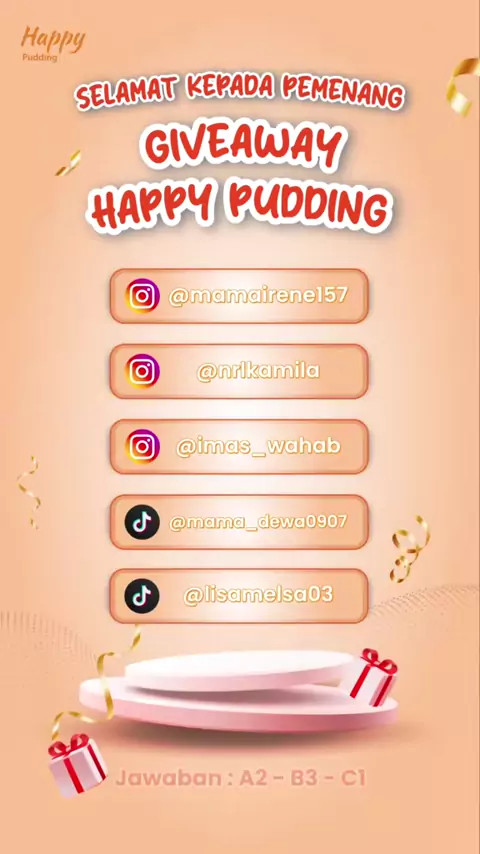 Selamat kepada 5 Happy Friends yang beruntung! π₯³ Bagi yang belum beruntung, jangan berkecil hati, masih ada kuis menarik lainnya yang menunggu kamu! π#HappyPudding#PuddingPraktisUntukUsaha#HobbyJadiRezeki