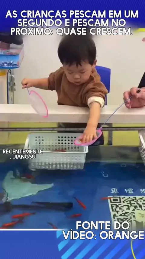 A criança pegou o peixinho e quase comeu o peixinho vivo.