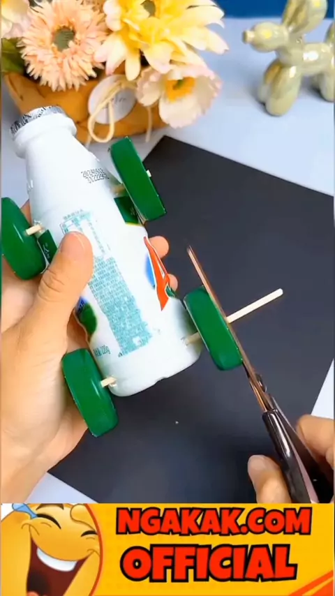 Use empty beverage bottles and balloons to make an air-powered car. The kids love it! Play with your kids during the summer vacation #DIY #airpoweredcar #emptybeveragebottles #balloons #kidsloveit