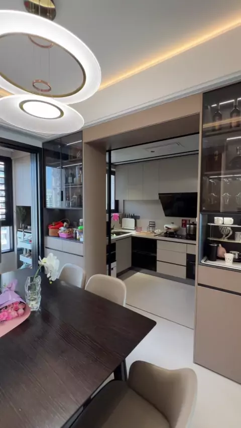 Dapur seluas kurang dari 5 meter persegi, dinding non-beban, lemari anggur di kedua sisi, pintu geser rel gantung, tersembunyi di belakang lemari anggur, membuka dapur terbuka dalam hitungan detik, dan masuk yang lebih luas.