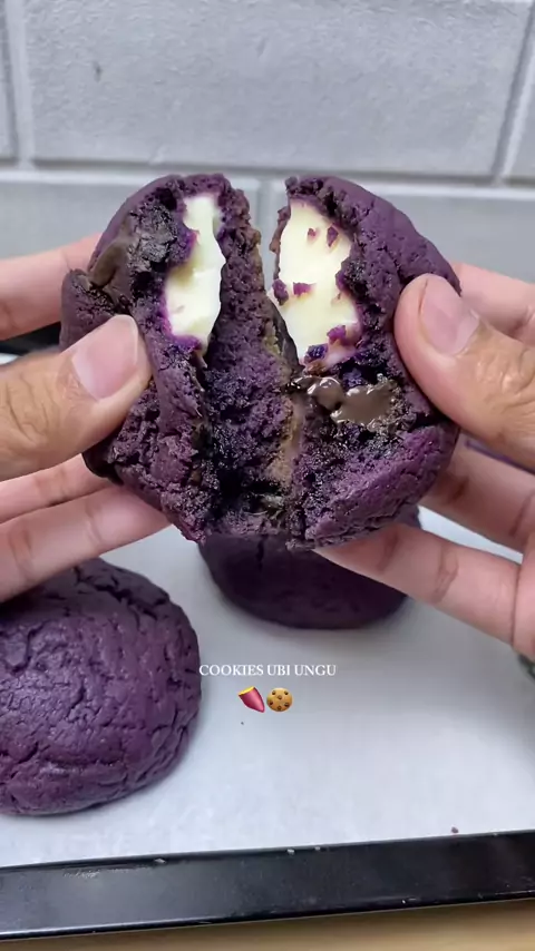 Cookies Ubi Ungu diisi dengan isian keju enak bgtt 😋 Resep : •100 gr butter •80 gr gula pasir •1 butir telur •1 sdt vanili •pasta ungu •2 sdm ubi ungu ( sudah dikukus ) •180 gr tepung terigu •1 sdt baking powder •potongan dark chocolate & chocochip •simpan di chiler 30 menit • bentuk bulat isikan dgn isian keju • simpan lagi dikulkas 30 menit • lalu panggang disuhu 180’C selama 15 menit api atas bawah #cookies #softcookies #ubi #ubiunggu # #pppppppppppppppppppppp