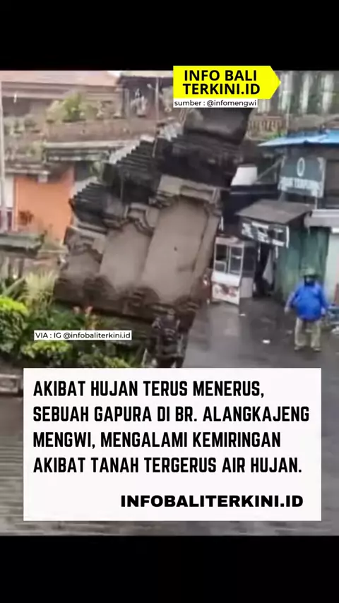 Hujan deras yang terjadi terus-menerus menyebabkan sebuah gapura di Jalan Batur, Br. Alangkajeng, Mengwi, Badung mengalami kemiringan setelah bagian bawah bangunan diduga jebol dan tergerus air. Kondisi ini berpotensi membahayakan pengguna jalan yang melintas. Diharapkan pihak terkait dapat segera melakukan penanganan agar tidak menimbulkan korban jiwa. 📸 infomengwi via: @infobaliterkini.id#denpasar#badung#mengwi#infonusabali#infodenpasar