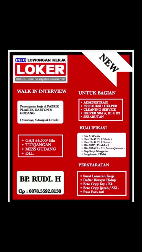 WALK IN INTERVIEW LANGSUNG KERJA PENEMPATAN KERJA SURABAYA , SIDOARJO & GRESIK Info /WA : 0878.5592.8130#tahunbaru2023#infoloker2023#lowongankerja#lokersidoarjo#lowongankerjaterbaru#loker2023#lokerterbaru2023#lokermadura#lokermojokerto#lokermalang#lowkerpasuruan#lokerpabrik#eventsurabaya#lokerlamongan#lokertuban#lokermojokerto#lokerjombang#lokerkediri#lokersma#lokersmp#lowongankerjagresik#infolokersidoarjo#infolokergresik#lokermalang#probolinggo#blitar#tuban#lamongan#surabaya#gresik#s...