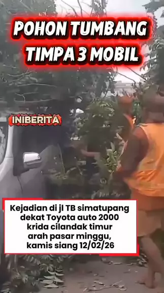 POHON TUMBANG TIMPA TIGA MOBIL. pohon tumbang di jl TB simatupang dekat Toyota auto 2000 krida cilandak timur arah pasar minggu. tidak ada korban jiwa namun terdapat 1 balita didalam salah satu mobil.Kamis siang 12/02/26 setelah adanya angin kencang yg menerpa selama beberapa detik dahan pohon besar patah dan menimpa 3 unit mobil yang sedang terkena macet lampu merah sumber: @JAKARTASELATAN24JAM #pohontumbang #angin #jakarta #pupr #fyp