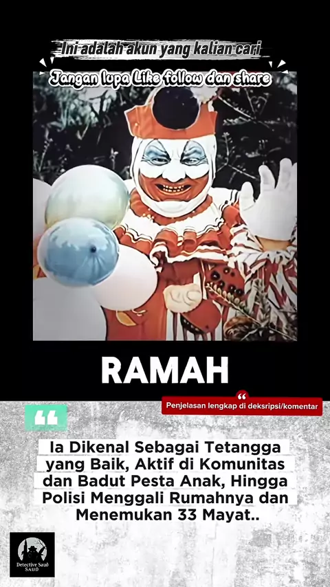 “Ia dikenal sebagai badut ramah di lingkungan tempat tinggalnya, namun di balik senyum itu, puluhan nyawa muda berakhir di ruang bawah rumahnya.” John Wayne Gacy adalah salah satu p3mb-nvh berantai paling kejam dalam sejarah Amerika Serikat. Antara 1972 hingga 1978, pria asal Illinois ini membunuh setidaknya 33 remaja laki-laki dan pria muda. Di mata publik, Gacy tampak sebagai warga teladan: pengusaha kontraktor bangunan, aktif di kegiatan sosial, bahkan sering tampil sebagai badut bernama Pog...