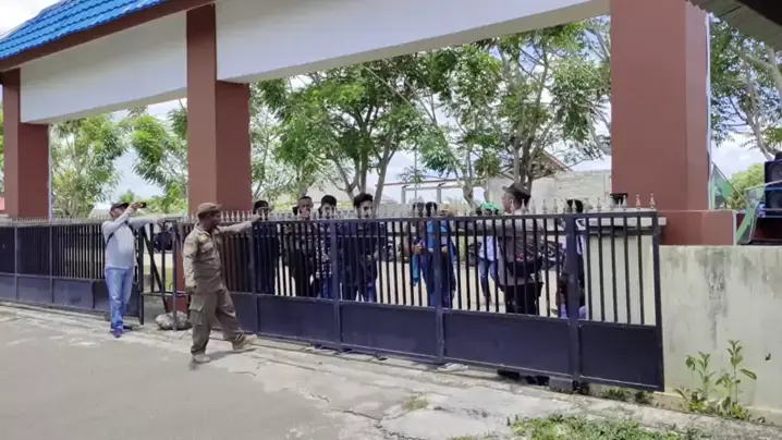 DEMO! Anggota Satpol PP Tertimpa Pagar Besi dan Kaca Pintu DPRD Buru Pecah Pintu pagar roboh dan kaca pintu kantor DPRD Kabupaten Buru pecah, saat demo puluhan kader Himpunan Mahasiswa Islam (HMI) Cabang Namlea, saat berunjukrasa di Kantor DPRD Buru, Maluku, Selasa (18/10/2022). Puluhan mahasiswa merobohkan pintu pagar tersebut. Sehingga pagar yang roboh itu menimpa kaki salah satu anggota Satpol PP yang bertugas di kantor perwakilan rakyat itu. #demo #dprdburu #pagar #buru