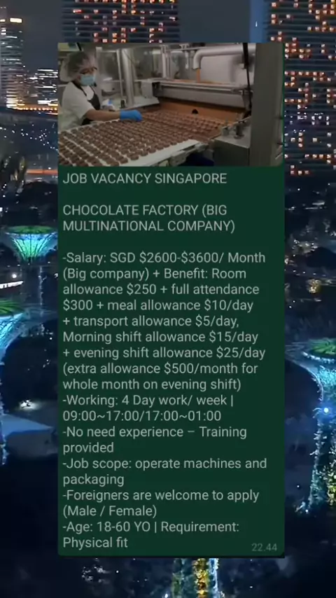 JOB VACANCY SINGAPORE CHOCOLATE FACTORY (BIG MULTINATIONAL COMPANY) -Salary: SGD $2600-$3600/ Month (Big company) + Benefit: Room allowance $250 + full attendance $300 + meal allowance $10/day + transport allowance $5/day, Morning shift allowance $15/day + evening shift allowance $25/day (extra allowance $500/month for whole month on evening shift) -Working: 4 Day work/ week | 09:00~17:00/17:00~01:00 -No need experience – Training provided -Job scope: operate machines and packaging -Foreigners ...