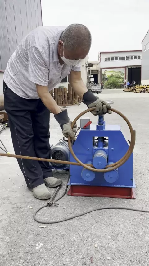 O velho trabalhador experiente ensina como usar o dobrador de tubos para dobrar o tubo redondo corretamente.