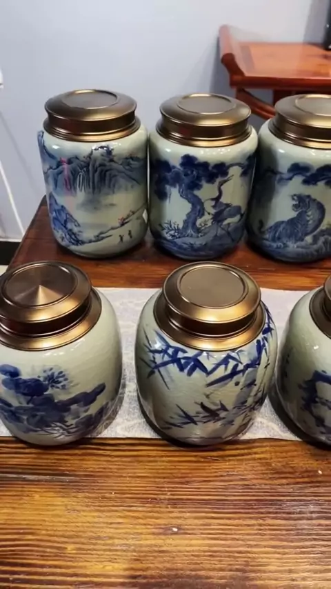 Tembikar tua porselen biru dan putih kaleng teh lapis ganda, desain penutup ganda yang dilukis dengan tangan untuk menyegel efek yang lebih baik, dan potongan tembikar tua penuh dengan cita rasa lama # Qinghua Porcelain # Tea Can # Jingdezhen Ceramic