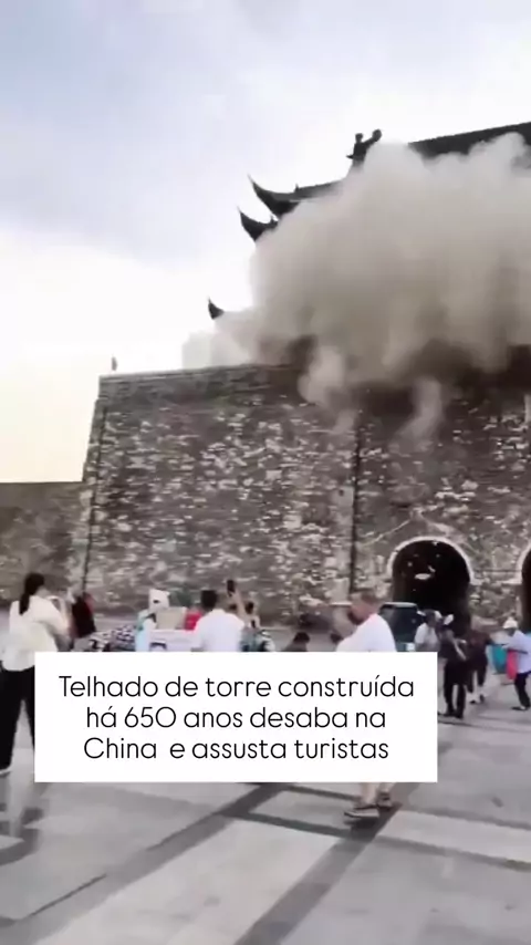TELHADO HISTÓRICO DESABA NA CHINA 🇨🇳 Vídeos que circularam nas redes sociais mostram o momento em que o telhado da Torre do Tambor de Fengyang, no leste da China, desaba. O incidente aconteceu nesta segunda-feira (19) e não deixou feridos, segundo as autoridades locais. O desabamento ocorreu apenas um ano após a reforma da estrutura. Construída no ano 1375, a torre é uma das maiores do tipo na China e uma importante atração turística da província de Anhui, de acordo com a mídia estatal. ...