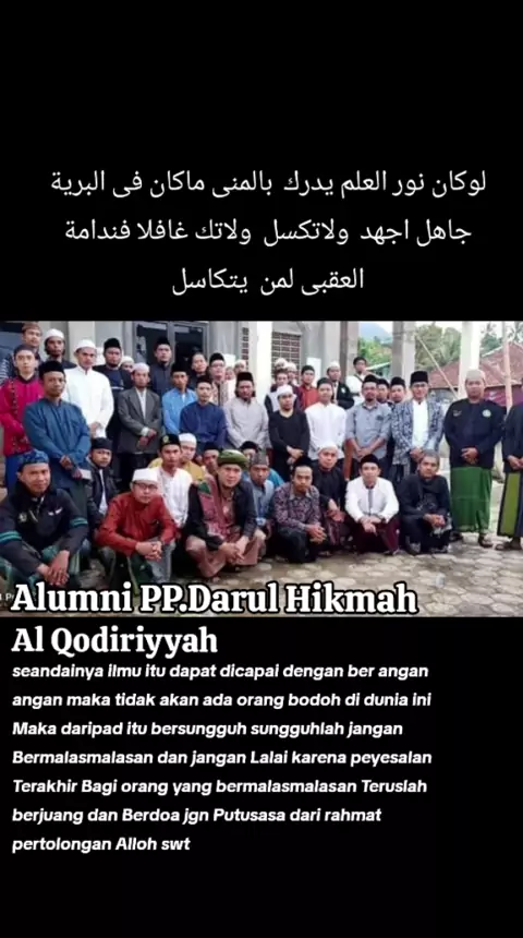 ALUMNI PP.DARUL HIKMAH AL QODIRIYYAH لوکان نور العلم يدرك بالمنی ماکان فی البرية جاهل اجهد ولاتکسل ولاتك غافلا فندامة العقبی لمن يتکاسل seandainya ilmu itu dapat dicapai dengan ber angan angan maka tidak akan ada orang bodoh di dunia ini Maka daripada itu bersungguh sungguhlah jangan Bermalasmalasan dan jangan Lalai karena peyesalan Terakhir Bagi orang yang bermalasmalasan teruslah berdoa jangan putus asa dari pertolongan rahamat alloh swt #nasehatbijak #Nasehatulama #nasehatislami #a...