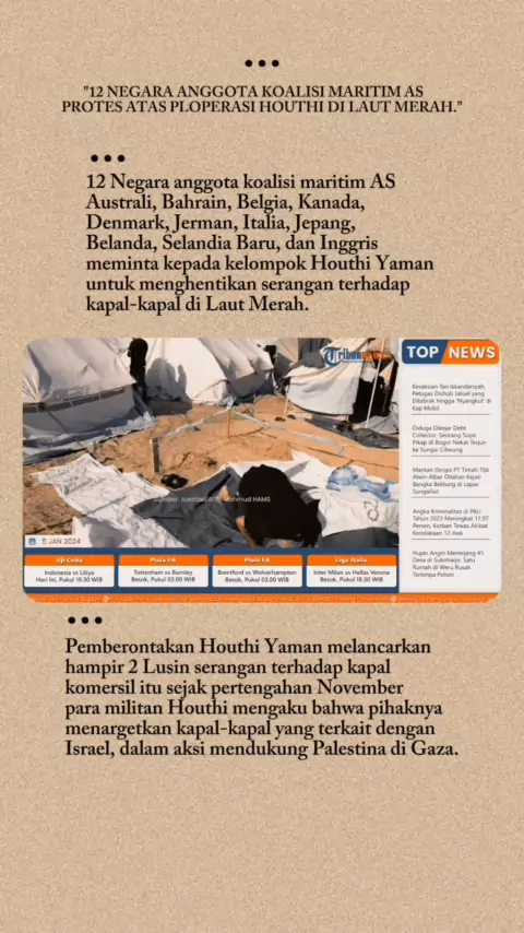12 Negara anggota koalisi maritim AS Australi, Bahrain, Belgia, Kanada, Denmark, Jerman, Italia, Jepang, Belanda, Selandia Baru, dan Inggris meminta kepada kelompok Houthi Yaman untuk menghentikan serangan terhadap kapal-kapal di Laut Merah. Pemberontakan Houthi Yaman melancarkan hampir 2 Lusin serangan terhadap kapal komersil itu sejak pertengahan November, Houthi mengaku bahwa pihaknya menargetkan kapal-kapal yang terkait dengan Israel, dalam aksi mendukung Palestina di Gaza. #saveyaman🇾