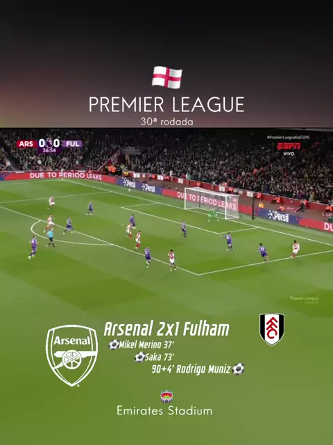 Arsenal 2x1 Fulham - Pela 30ª rodada da Liga Inglesa, vitória dos mandantes. #PremierLeague #gol #futebol #ARSENAL #fulham