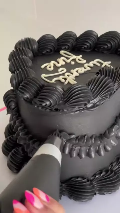 Barbie soundtrack for the least barbie cake ever 🫣#blackcake#heartcake#retrocake#lambethpiping#blackheartcake#perth#cakedecorating
