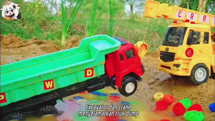 Excavator dan crane menyelamatkan truk dump