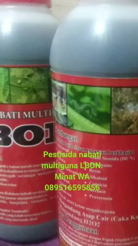 *L'BON* adalah *cairan obat Hama dan penyakit tanaman* di ekstrak dari belasan tanaman berkhasiat yang dilengkapi dengan kandungan Asap Cair, Hydrogen peroxide H202 dan Azadiraktin sebagai kandungan unggulan produk ini dan telah dipercaya oleh para ahli pertanian mampu membasmi segala jenis hama dan penyakit seperti wereng, kutu putih, semut tanah, cacing emas, ulat grayak, kutu kebul, lembing, serta penyakit. Info selengkapnya WA 089516595856